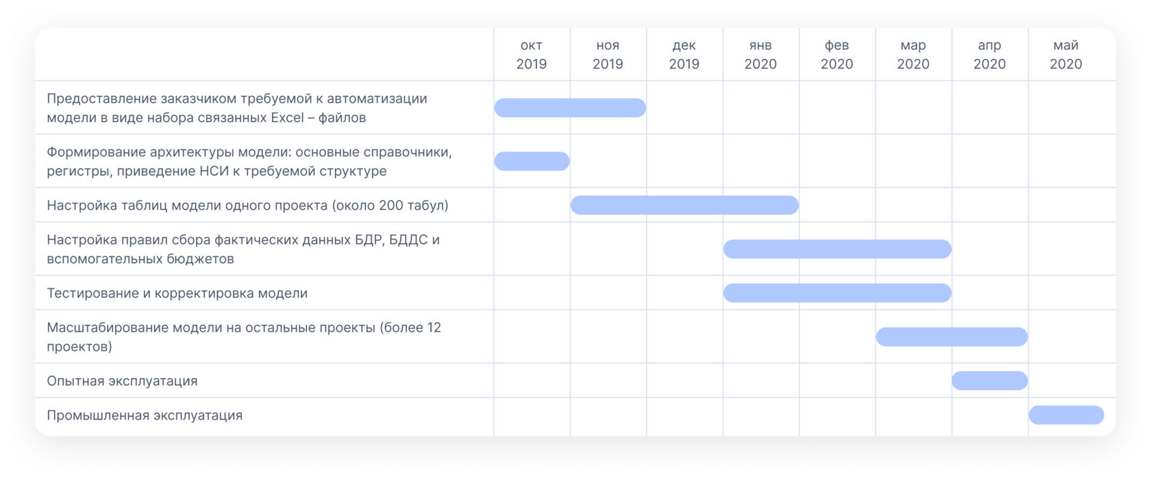 Модель была скопирована для всех проектов заказчика, проведены индивидуальные настройки под каждый проект, построено общее «Дерево» действий, объединяющее все проекты. Итоговые отчеты настроены для вывода общих по компании и по проектам итоги. Проведен тест работы общей модели.